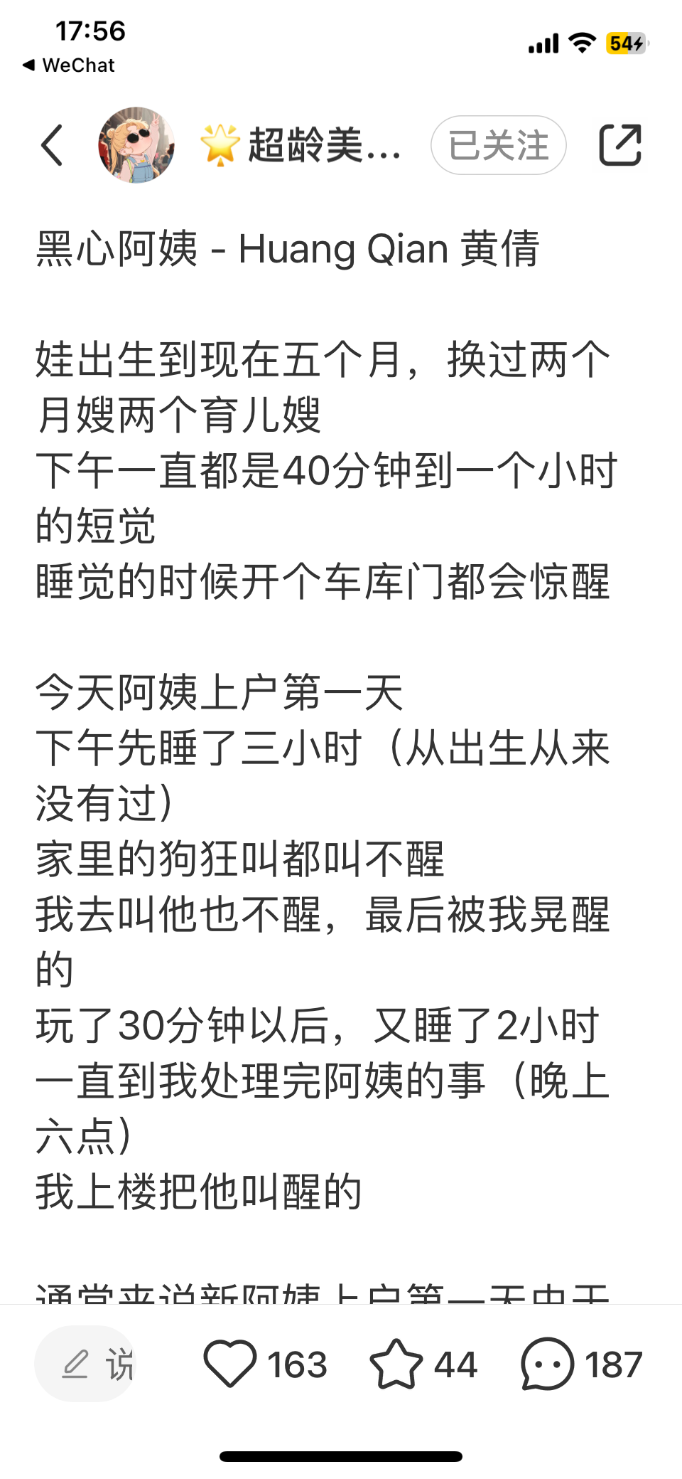 月嫂性格开朗,很喜欢跟我们分享她自己的事情。跟我们说她人生特别的苦,前夫骗她让她欠很多债。我特别欣赏她,虽然生活不容易,但她还是带着微笑努力生活。她还告诉我们她的上一户雇主对她很刻薄!不给她饭吃!她在他们家 45 天就瘦了十几磅。我心疼的跟阿姨说:"阿姨你别担心。你只要顾好我孩子就好。我人很随和,什么都可以就是一定要带好孩子"。