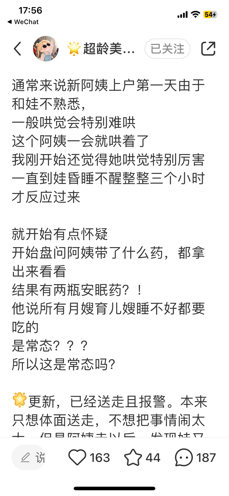我还心疼月嫂的经历,每天给她泡咖啡、高丽参茶。我也很努力学习带娃,怕让她太辛苦,什么家务都不用她做!开始她也挺好的。起码有给我做三餐。她一直给我强调要以孩子为先,所以让我早上亲喂。我奶量当时就 200+ ml,每天都很胀!她叫我用小花吸,然后晚上她负责喂,但必须要我泵新鲜的给她,说是对孩子好。她还要我每两个小时泵一次,泵出来的奶又不给宝宝喝,全冻了起来。我在医院陪宝宝的两周,由于没吃好休息好我身体已经很虚弱了!结果回来后她还要我整夜不睡亲喂宝宝,也不解冻冰箱里的奶给宝宝喝。我的身体状况越来越不好,就像被榨干了一样!因为月嫂要我不停的泵奶我的奶量从 200ml,涨到了 360ml。由于加上营养不足,奶量还在不断增加导致我的脸色毫无血色,瞬间衰老!