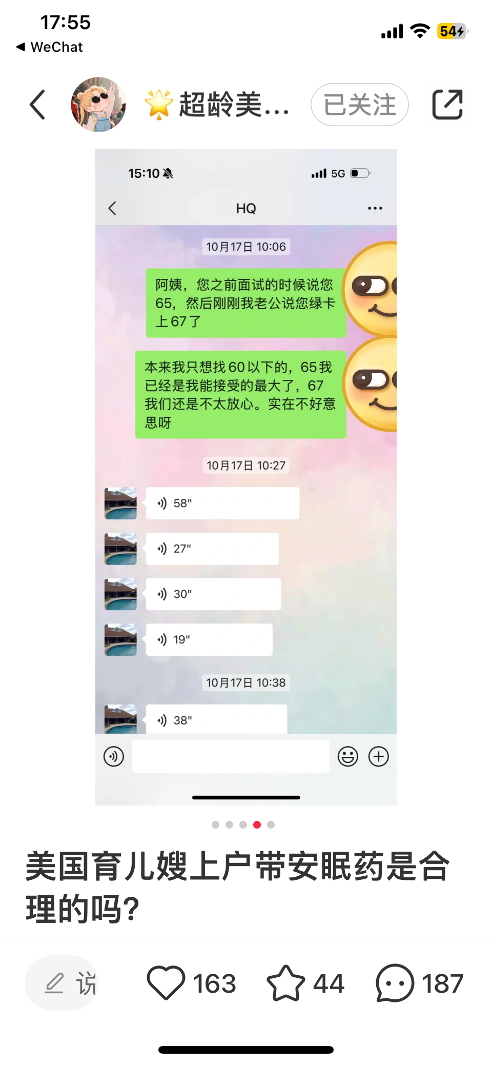 \$300/天带 4 个小月娃,不照顾宝宝,每天要吃牛油果、全麦面包、苹果、酸奶。下午到岗算一整天钱,离岗中午走算一天钱。带娃看手机。