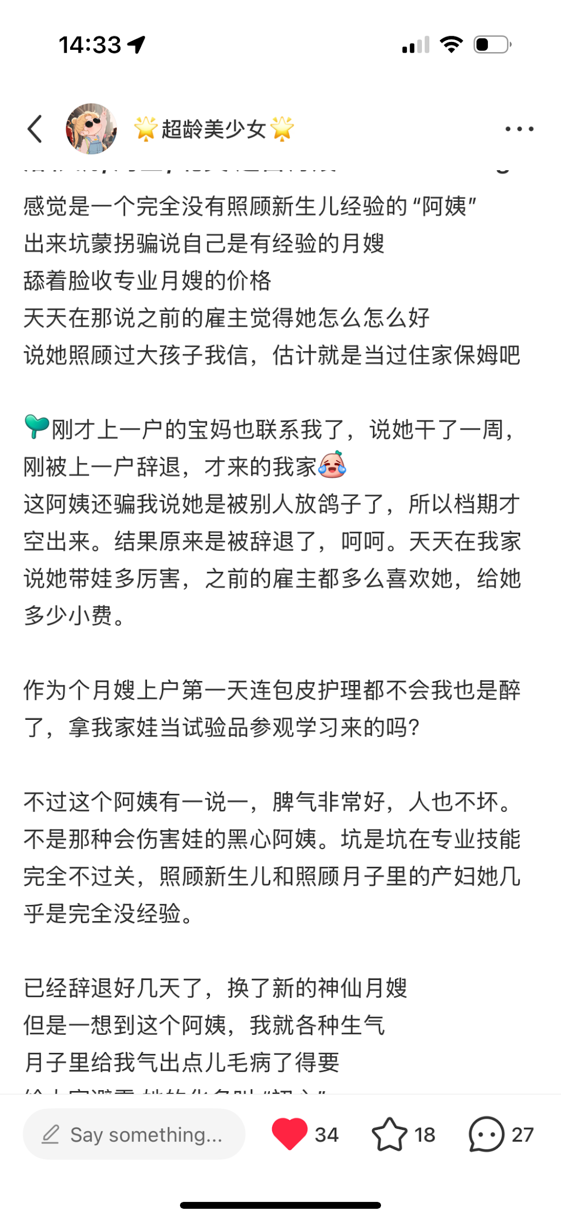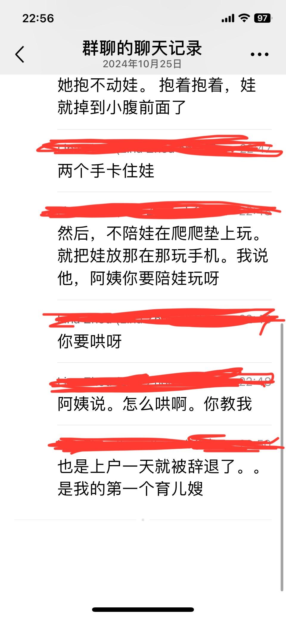 经常抱怨月中饭菜不好吃、吃不饱、钱给的少。我忍着想给买点点心让她帮我把孩子带好,但是没想到⋯还有很多细节都很奇葩。一直说自己天津几套房生活怎么讲究吃喝穿。孩子如何带不提,只会提美容、衣服、八卦前雇主。还会挑拨离间说这个办证的人不好⋯哪个宝妈不好。经常暗示前雇主给了什么什么⋯