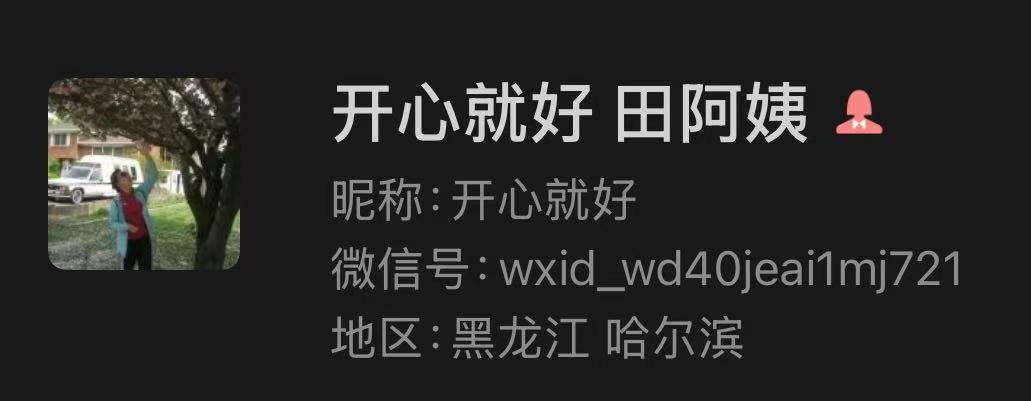 - 阿姨叫田 Ruxia(大概是,不给拍证件,只让扫了一眼),哈尔滨人,六十岁左右,人称"娇气阿姨"